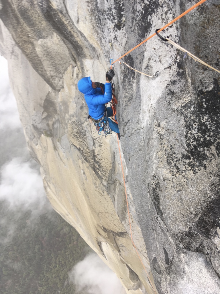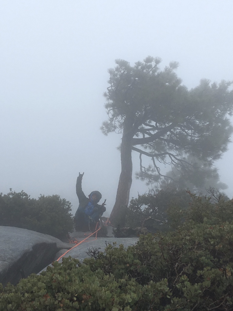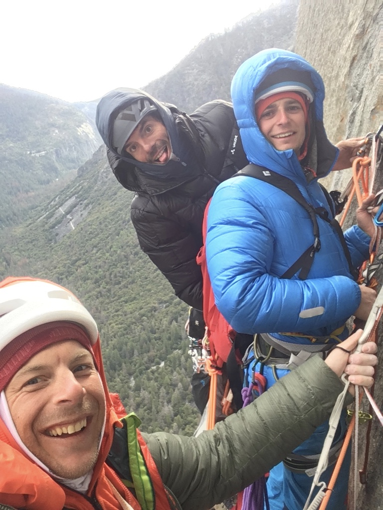 - Die Nacht verging schnell und am Morgen sah ich schon eine weiße Wand ins Valley hereinziehen. Munter kletterten wir Seillänge für Seillänge weiter und im ca. 10:00 Uhr, ich war gerade in der „Changing Corners“ schwebten die ersten Schneeflocken an mir vorbei. Solangs nicht schlimmer wird, kein Problem, dachte ich mir. Als Uli und Tobi am Stand ankamen, wurde aus dem Schneefall Schneeregen und die ganze Wand war komplett nass. An Freiklettern also nichtmehr zu denken, denn der ohnehin schon glatte Granit ist im nassen Zustand rutschig wie Seife. So kämpfte ich mich mit den Leitern und allen Friends nach oben, als Uli plötzlich den letzten Friend #1 nicht mehr befreien konnte und wir somit keinen einzigen mehr von dieser Größe hatten, wurde auch ich kurzzeitig nervös. Doch wir erreichten komplett durchnässt und durchfrohren die Boltleiter und ich wusste weit ist es nicht mehr. Im kompletten White Out stiegen die Jungs an den Jümars nach und plötzlich öffnete sich die Wolkenwand und sie bekamen den vollen 1000 Meter Tiefblick. Als ich das Seil am El Cap Tree fixierte und wenig später die Jungs am Gipfel ankamen war die Erleichterung bei allen groß. Was für ein Trip. Und was für eine geile Tour. Aus dem geplanten gemütlichen sunny california Big Wall Abenteuer wurde ein „Patafornisches“ Big Wall Abenteuer und wir scherzten, dass Tobi wohl so schnell nichts mehr aus der Ruhe bringen wird. Nach dem verdienten Gipfel „Budweiser“ stiegen wir über die nassen Platten der Eastledges ab und erreichten im Einbruch der Dunkelheit das Auto. Next Stop: Burger und Bier und dann trockene Klamotten.